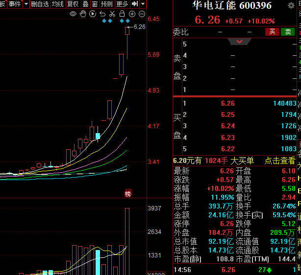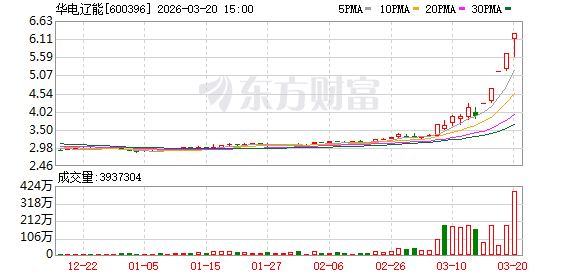 公开交易数据显示,华电辽能近期持续快速上涨。自3月16日以来,截至3月20日收盘,华电辽能连续涨停,连续五个交易日内日收盘价格涨幅偏离值累计达到64.72%。其中,3月20日,华电辽能共计成交393.7万手,成交额24.16亿元,换手率26.74%,均创下近期新高。